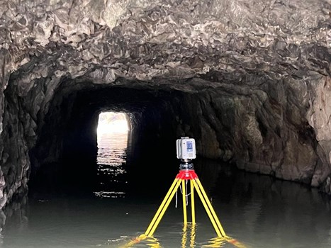 Scan avec un RTC 360, déplacement des instrument à l'aide d'un bateau pneumatique. Relevés complémentaires du fond du lit au théodolite.